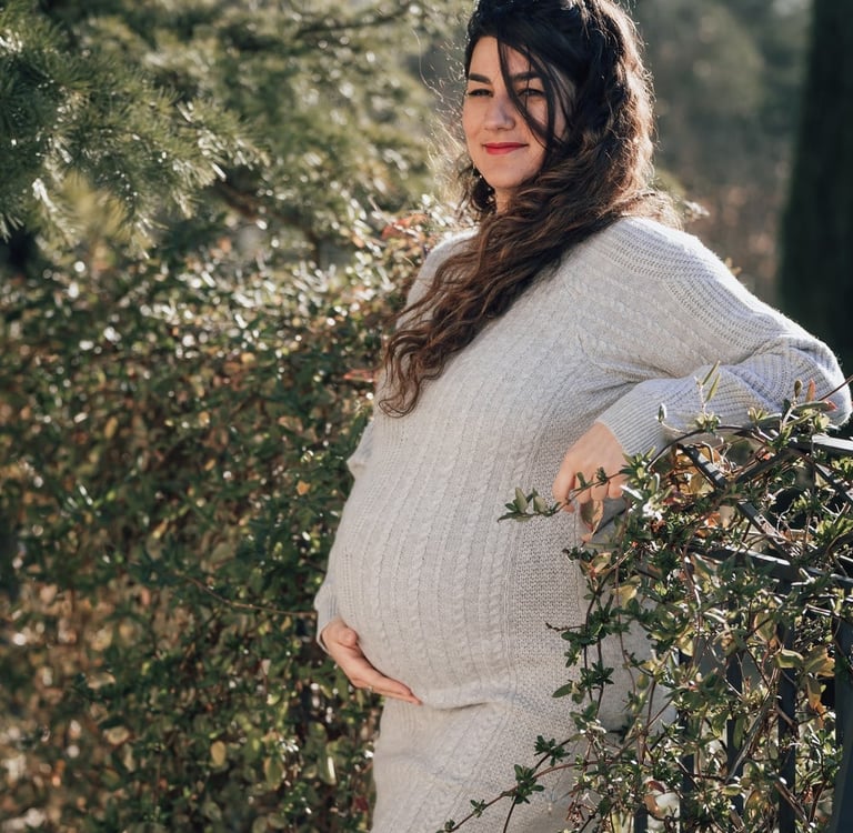 Ventre Bien Rond : À la fin du deuxième trimestre et au début du troisième trimestre, le ventre de la future maman est bien rond et visible, ce qui est idéal pour mettre en valeur la beauté de la grossesse.